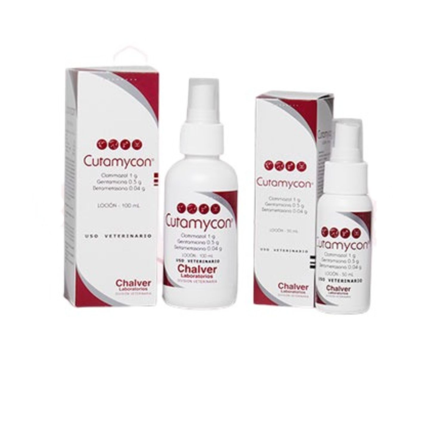 Cutamycon Loción es una loción dermatológica para perros y gatos indicada para afecciones de la piel agudas o crónicas, ayudando a controlar hongos, bacterias e inflamación en la zona afectada. Se aplica directamente sobre la piel y se adhiere con facilidad para brindar alivio de los síntomas, sin manchar. Está disponible en varias presentaciones (50 mL y 100 mL). Producto de uso veterinario: consulta a tu veterinario antes de usar.