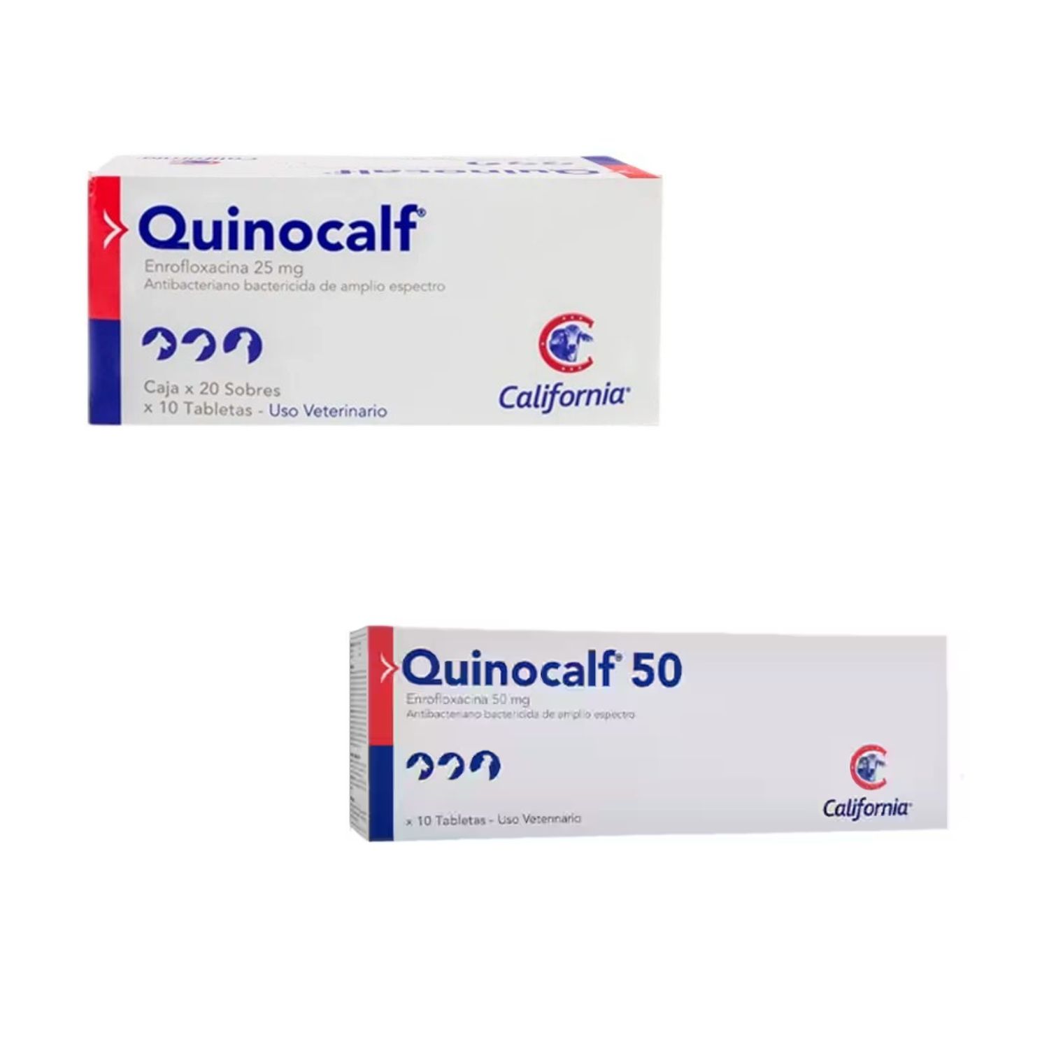 Quinocalf es un antibiotico antibacteriano de amplio espectro para perros y gatos, indicado para el tratamiento y control de infecciones bacterianas respiratorias, digestivas, genito-urinarias y de piel, entre otras segun indicacion. Su principio activo, la enrofloxacina, actua contra bacterias sensibles para ayudar a disminuir la infeccion y favorecer la recuperacion. Se ofrece en varias presentaciones por miligramos, por lo que la dosis se ajusta al peso. Usar bajo supervision del medico veterinario.